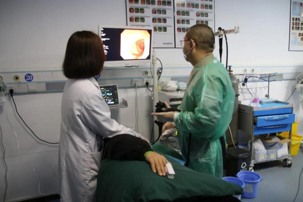 金年会金字招牌消化内科主任刘爱民在胃镜室进行指导。